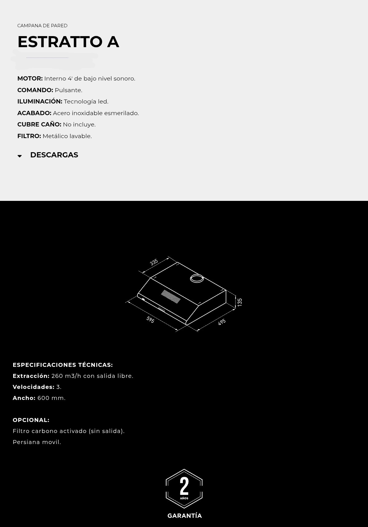 Tipo: Campana Extractora de Pared (Opcional Sin Salida Al Exterior mediante filtros de Carbón Activado)
